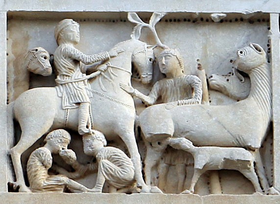 San Cerbone, peraltro, ha con gli animali un feeling particolare. Nelle altre scene dell’architrave, infatti, proseguendo verso destra, sono descritti due altri episodi in cui questo rapporto simbiotico dà luogo a situazioni quasi magiche: mentre va verso Roma scortato dai legati papali che lo conducono al cospetto del Pontefice, il santo vescovo prima fa dissetare i compagni di viaggio con il latte di due cerve che rispondono al suo richiamo; poi convince alcune oche a seguire la comitiva fino a Roma, e solo una volta arrivato nell’Urbe le lascia libere di andarsene. L’ultima scena dell’architrave potrebbe rappresentare, con una logica progressione, l’esito del viaggio, con san Cerbone che celebra la messa insieme al Papa, riconciliato, e anzi, secondo la tradizione, stringendogli la mano permette anche al pontefice di ascoltare i cori angelici.