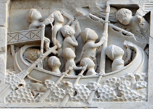 La prima formella a sinistra, invece, dice di un viaggio in nave. Potrebbe rappresentare la traversata del vescovo dall’Africa in Maremma; ma è più probabile che racconti un altro episodio, l’ultimo della leggenda del santo. Cerbone, infatti, subentrati agli ostrogoti i longobardi, fu costretto a lasciare Populonia e trovò rifugio sull’isola d’Elba. E però espresse la volontà di essere sepolto in terraferma, e lasciò quindi ai suoi precise istruzioni perché portassero la sua salma, di notte, sulle spiagge della Maremma, e perché riprendessero il mare subito dopo le esequie, per non incappare nell’ira dei nuovi padroni della regione. Quando Cerbone morì, tutto avvenne secondo le sue istruzioni, e il viaggio della nave dall’Elba alla spiaggia di Populonia fu protetto dall’oscurità e dalla piaggia, che nascose l’imbarcazione ma non la bagnò nemmeno con una goccia: e forse è proprio questa traversata misteriosa, svolta sotto lo sguardo protettivo di un angelo, ad essere raccontata nel primo riquadro.