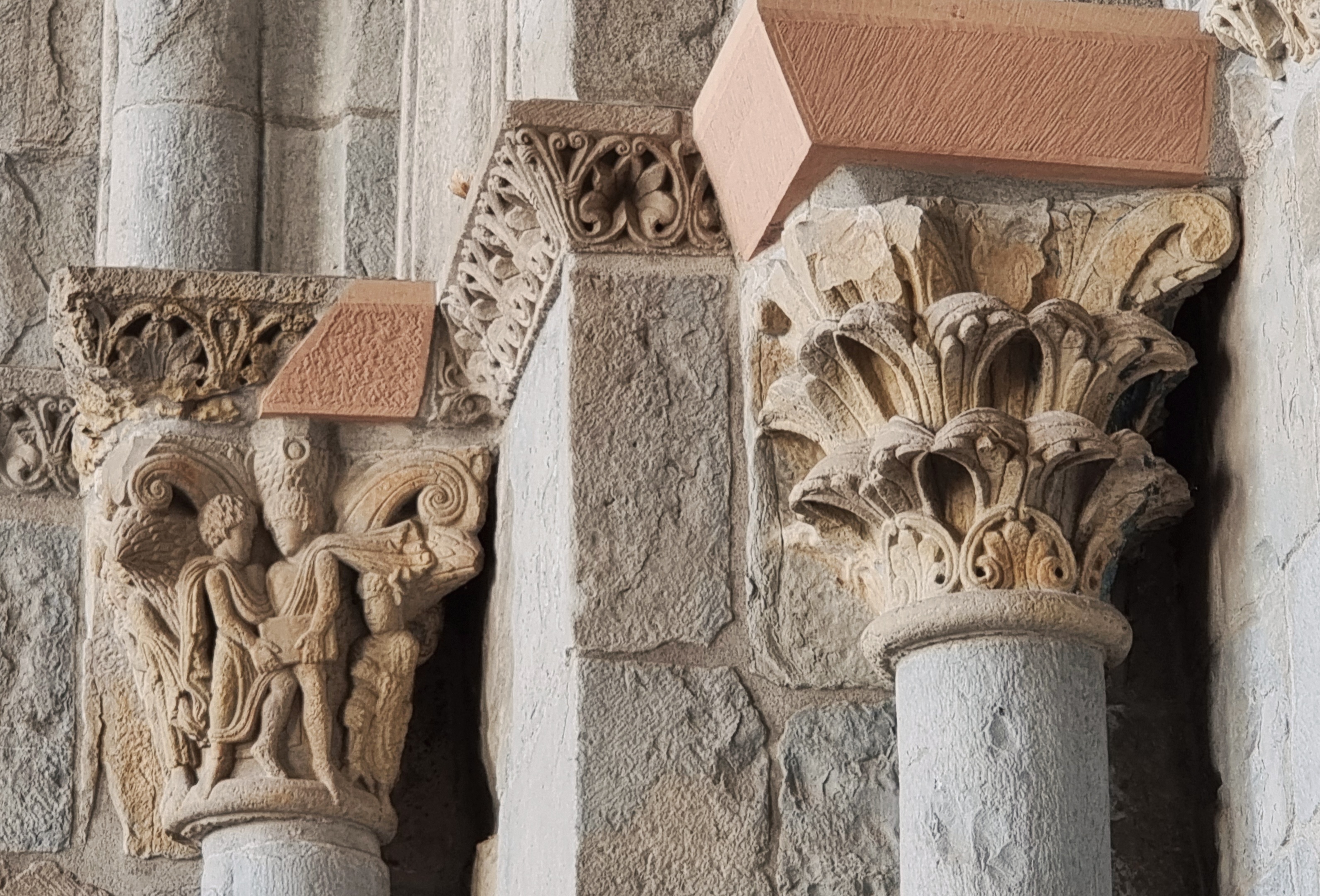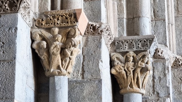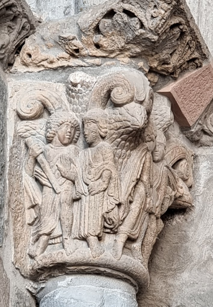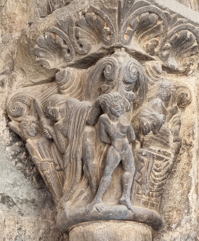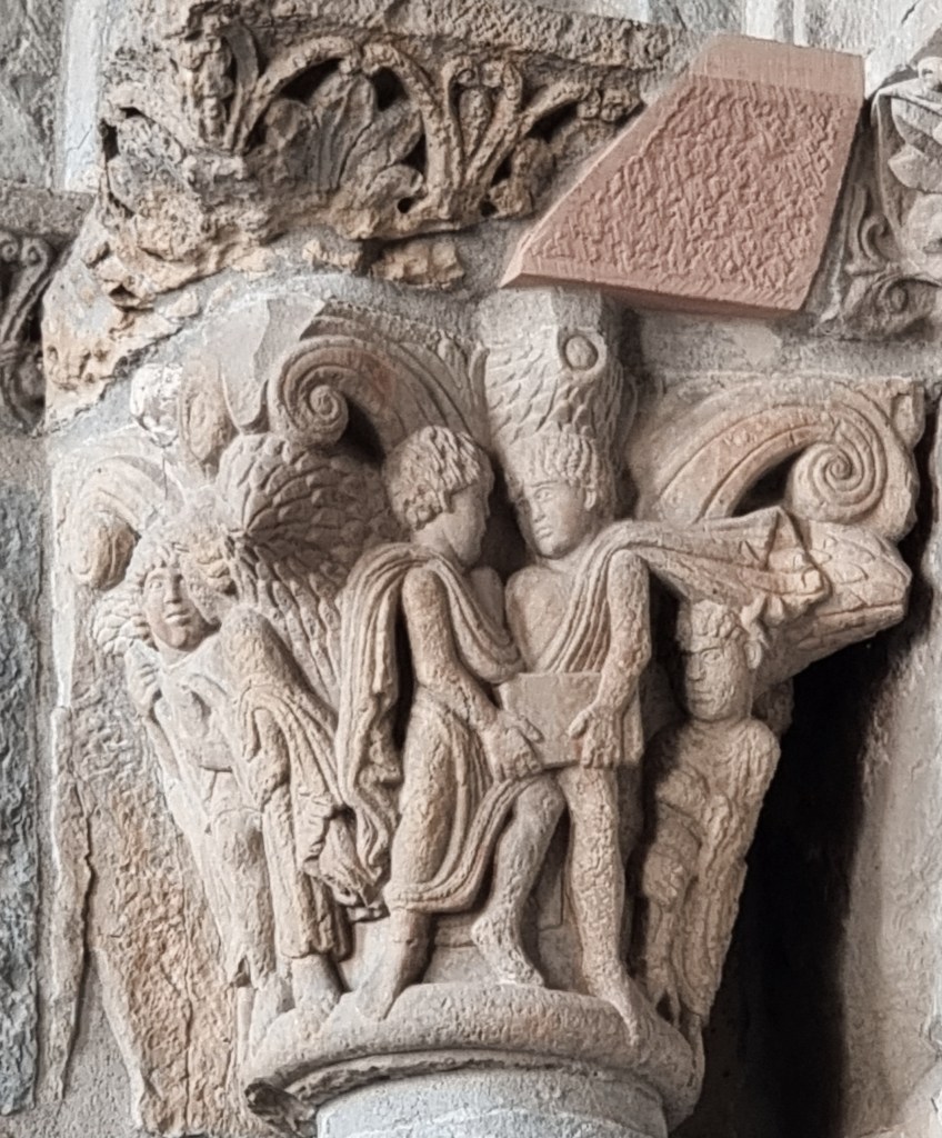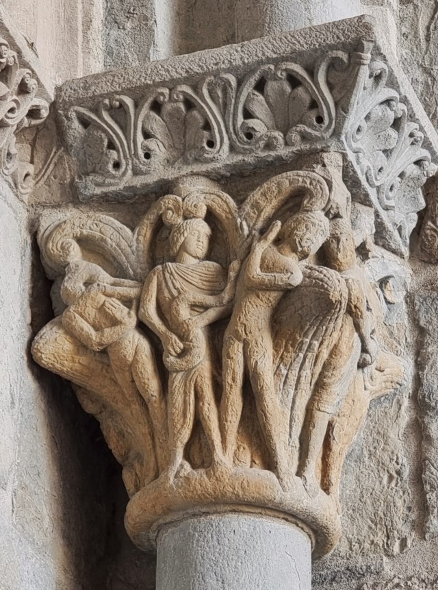 Si noti il perfetto equilibrio tra vuoto e pieno che regna in tutti questi rilievi: l’horror vacui di un certo romanico – confrontiamo questo capitello con quello del Cabestany a Sant’Antimo, o con quello realizzato sempre dallo stesso scultore a Saint-Papoul? – qui si trasforma in padronanza dell’impaginazione, e in un alternarsi di figure che sembrano addirittura muoversi e dialogare nello spazio come seguendo una partitura musicale.