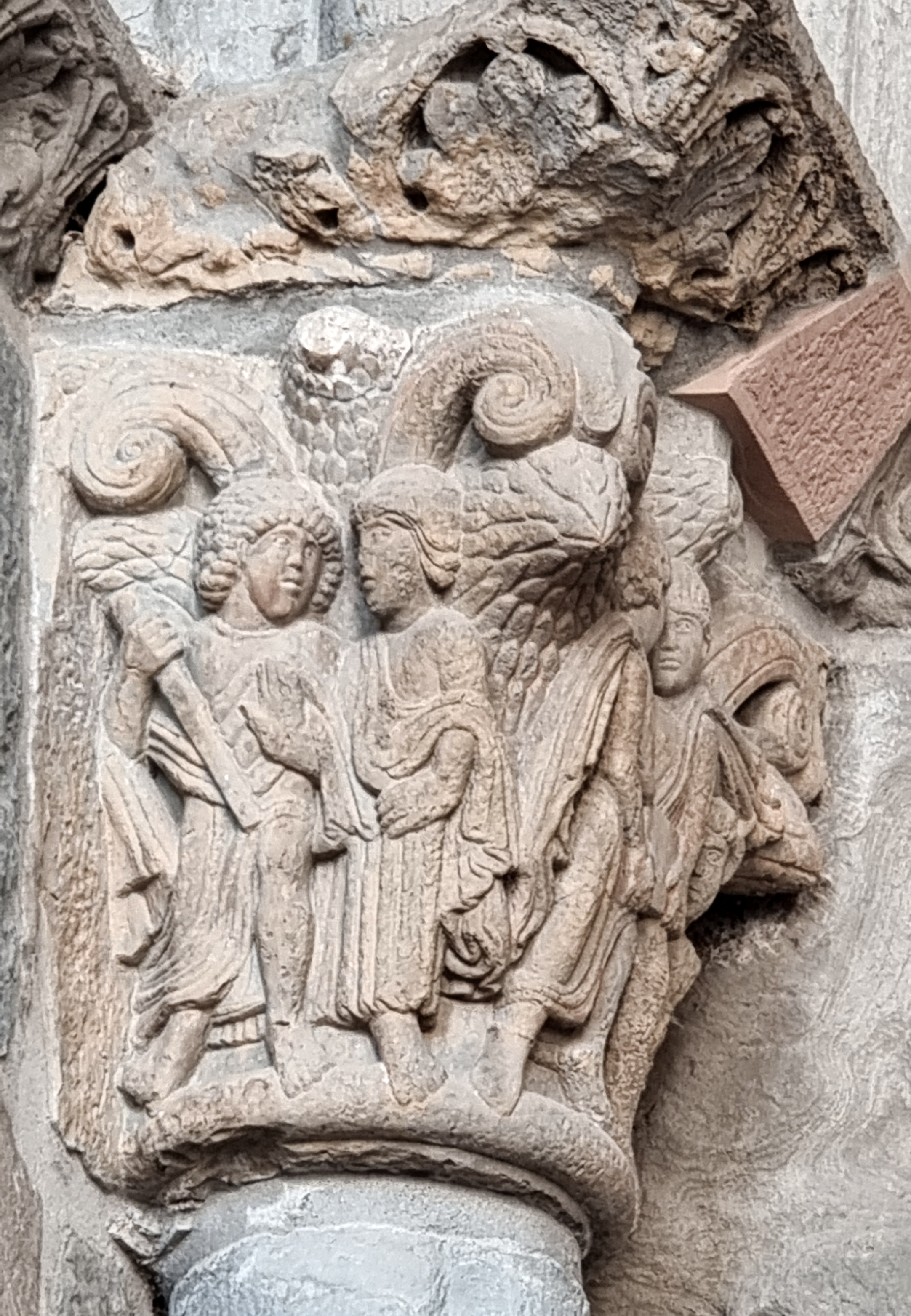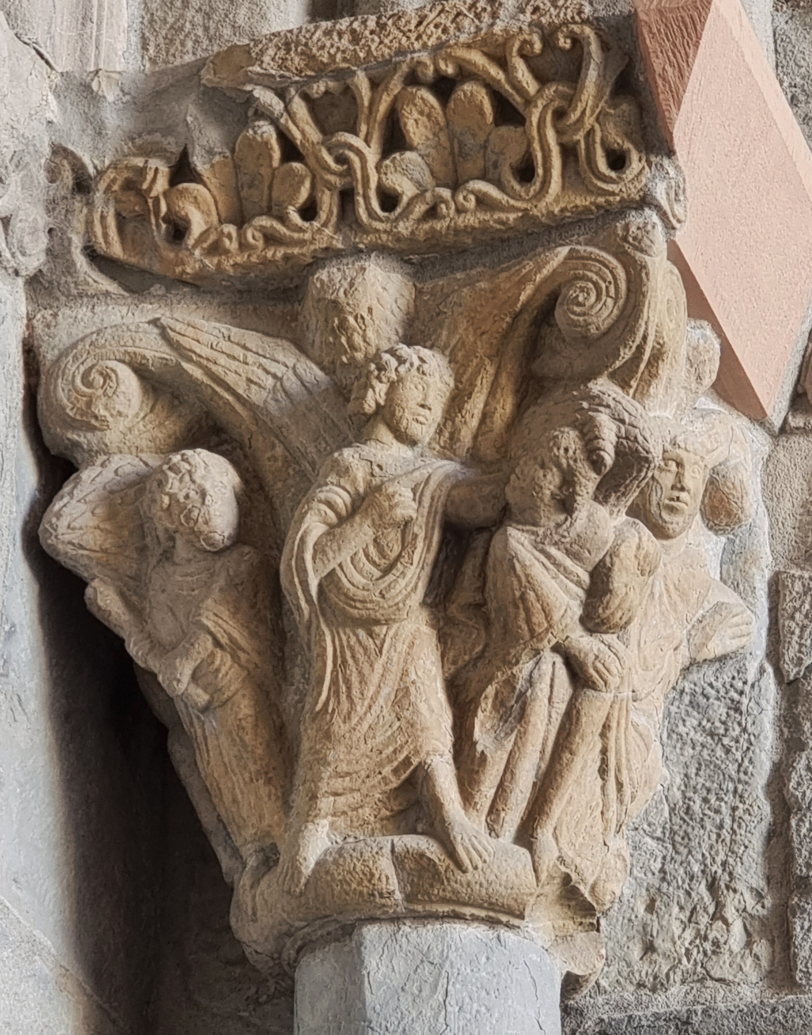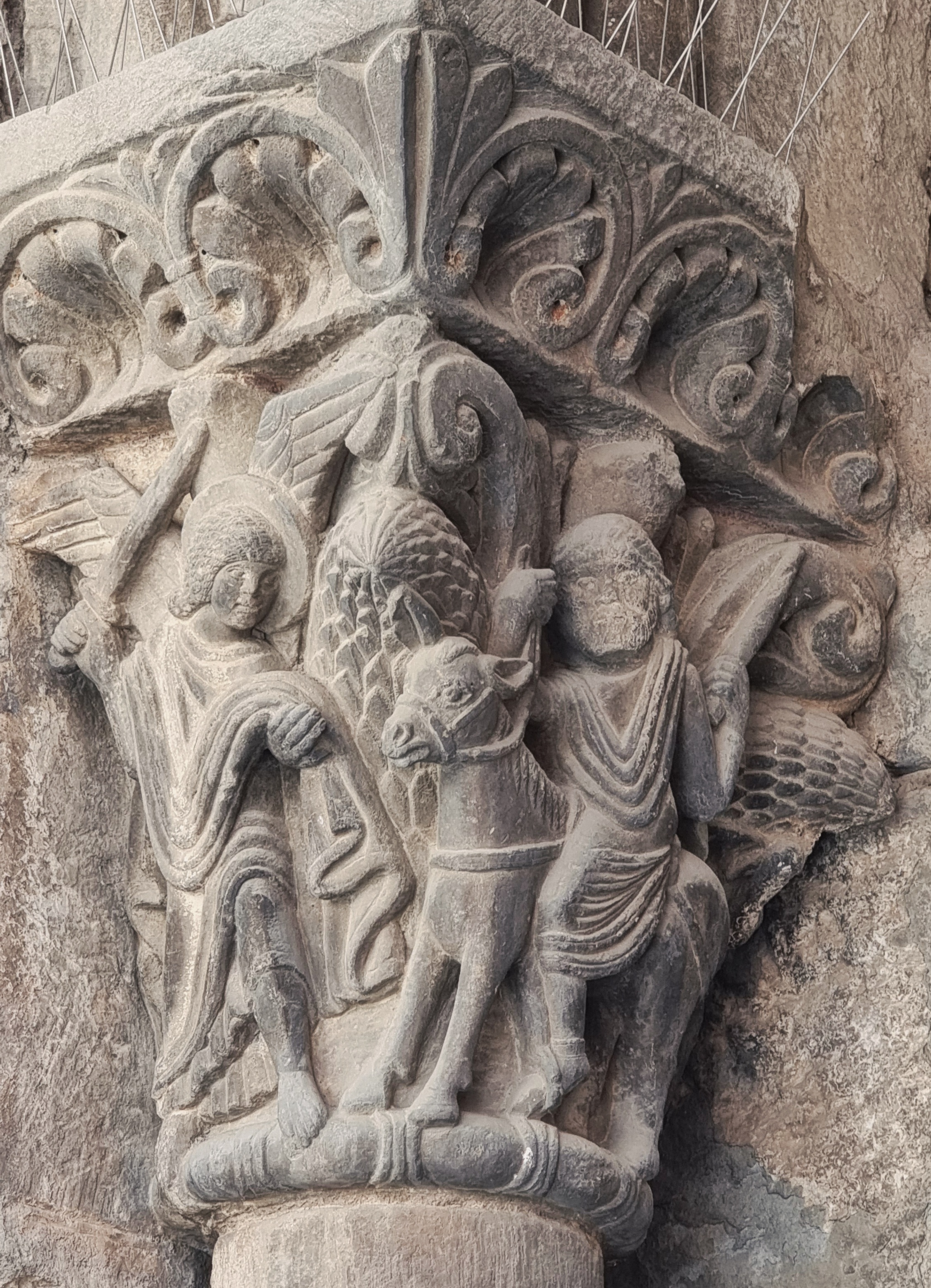 Si osservino anche, qui ma anche in altri capitelli della serie, i particolarissimi bulbi fogliati che appaiono negli angoli, all’estrema sinistra e tra le due teste di Abacuc e Daniele, ma anche in alto tra le ali spiegate dell’angelo: sono un tratto distintivo dei capitelli del maestro di Jaca, e secondo le interpretazioni più recenti – anche qui il merito va, credo, ad Antonio García Omedes – rappresentano l’acanto non ancora sbocciato.