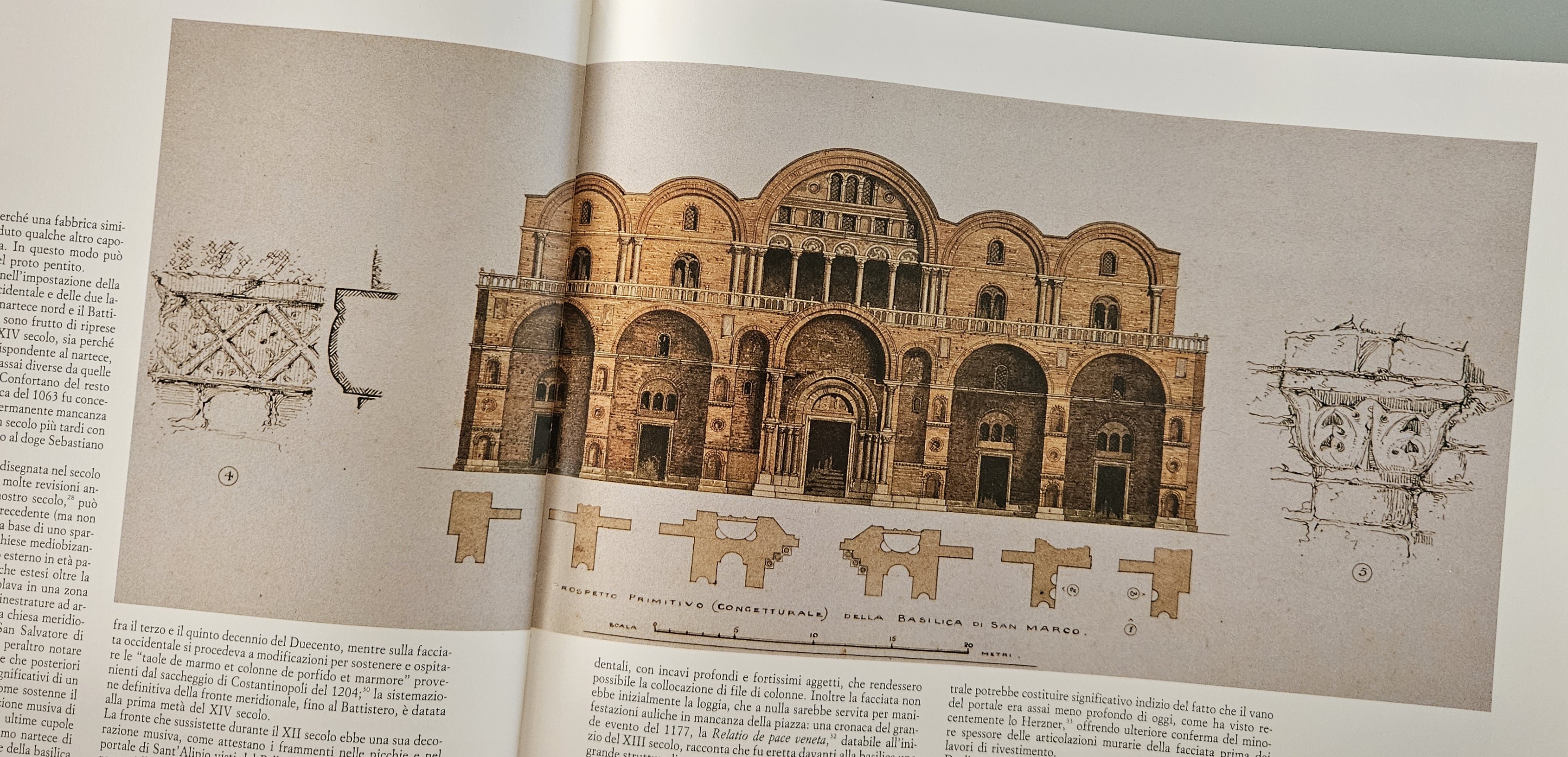Dobbiamo però immaginare questa seconda San Marco della fine dell’XI secolo, costruita da maestranze locali, priva all’interno della splendida decorazione musiva delle volte e delle cupole e dei marmi che adornano le pareti; allo stesso modo, per immaginarne la facciata e l’aspetto esterno complessivo, è necessario spogliare l’edificio dall’ornamentazione in marmi e sculture che la coprono oggi quasi completamente. All’interno, mosaici e marmi furono aggiunti solo dalla metà del XII secolo, a partire dal 1159; all’esterno, è dal sacco di Costantinopoli, nel 1202, che si cominciò ad aggiungere la ricchissima decorazione creando, durante tutto il XIII secolo, addirittura una nuova facciata, quasi una maschera di marmo preziosi davanti a quella sobria della seconda San Marco; la quale invece “era in mattoni a vista – spiega la Suitner – con pareti lisce scandite da lesene e con decorazioni ceramoplastiche, analoghe probabilmente a quelle esistenti sulla facciata dell’abbazia di Pomposa, con profonde nicchie”, proprio come ipotizzano le ricostruzioni degli storici dell’arte, come l’acquerello di W. Scott dai disegni del Pellanda.