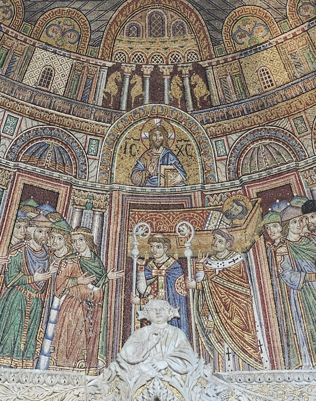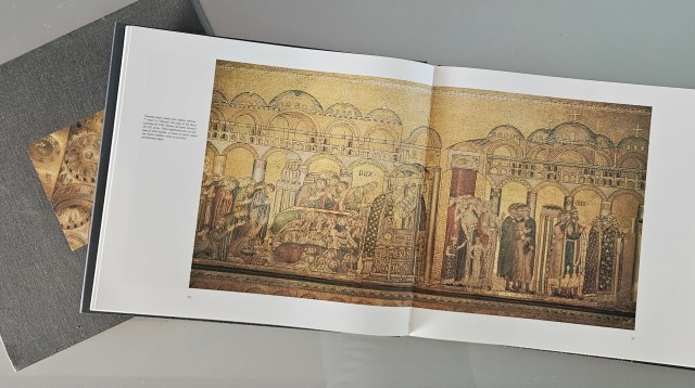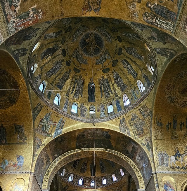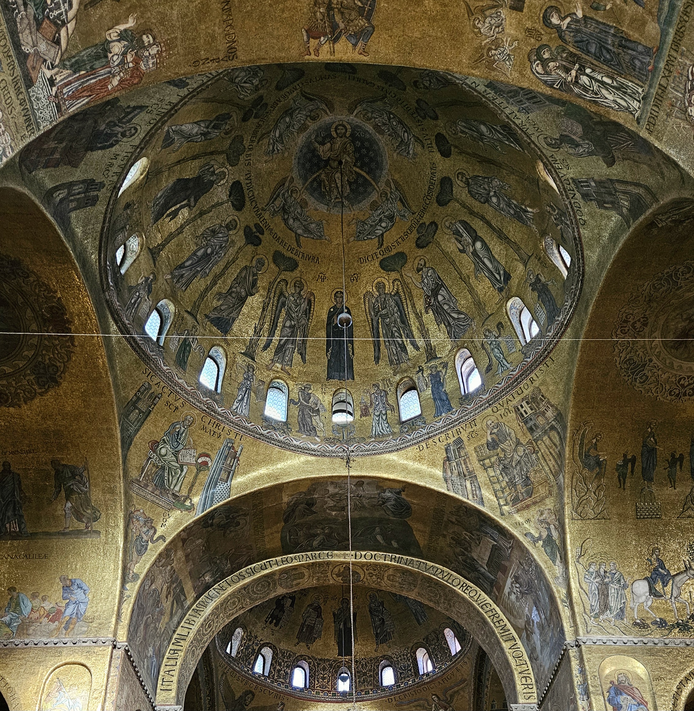 E per avere conferma di come le coperture delle cupole della seconda San Marco seguissero il modello della chiesa di Santa Sofia a Costantinopoli e di tante chiese della tradizione bizantina, possiamo farci aiutare da un altro mosaico della stessa basilica: meno noto di quello della porta di Sant’Alipio, collocato nel braccio sud del transetto e datato ai primi anni del XIII secolo, questo secondo mosaico ci offre come uno spaccato dell’interno della chiesa, e mostra appunto le cupole, decisamente ribassate, forate da una fila di finestre nella curvatura, e coperte nel rispetto di questa loro conformazione, proprio come accade a Santa Sofia.
