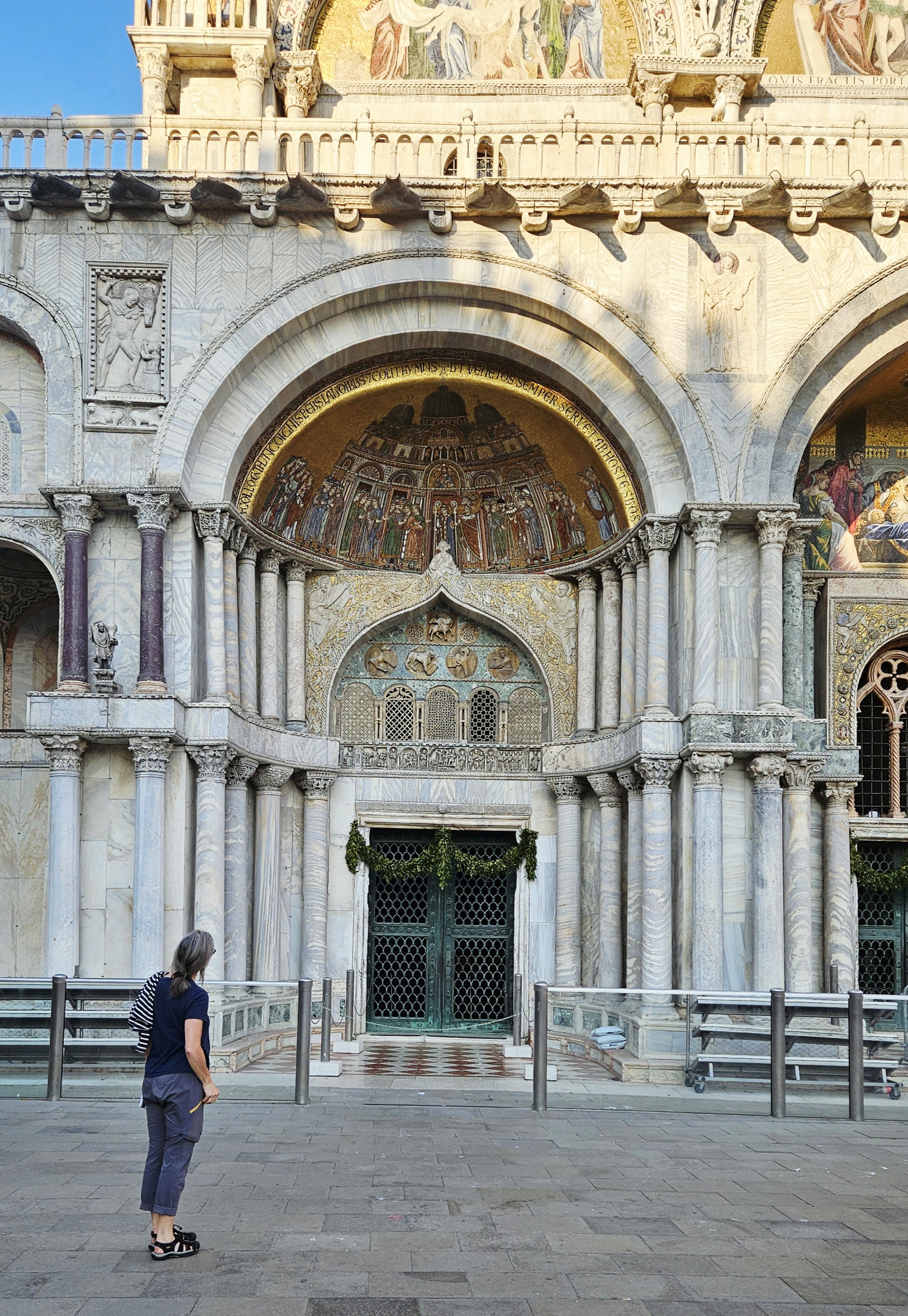 Se la realizzazione della decorazione musiva ha certamente fatto dell’interno di San Marco uno scrigno d’oro unico al mondo, la facciata – possiamo ammetterlo? – alla fine è un pastiche che si fatica a definire. Dice bene Gianna Suitner: “Al di là della matrice che, come si è visto, è riconoscibile solo attraverso un processo di astrazione, l’esito architettonico non è sicuramente riconducibile a coevi prodotti del mondo bizantino (…). Non è però individuabile neppure una derivazione dal linguaggio romanico” che, se c’era, stava appunto nella facciata realizzata alla fine dell’XI secolo. Non resta che concludere che “i connotati di San Marco possono essere riassunti in una sommatoria di tradimenti compositivi, di anomalie formali e tipologiche, di elementi decorativi disomogenei (…). Queste contraddizioni non hanno impedito tuttavia un risultato originale e affascinante. Se il fascino sta soprattutto nel pittoricismo e nella vivacità cromatica, l’originalità è da individuare non tanto in un apparente esotismo [che l’aspetto esterno attuale non può dirsi certamente bizantino (nrd)], quanto in una particolare stratificazione di forme e di modi di diversa radice, accostati senza eccessive preoccupazioni sintattiche”.