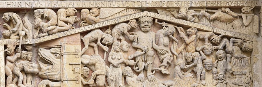 Quindici peccatori esemplari, quindici peccati con relative pene: l'"inferno" di Conques, la metà destra del grande portale romanico, dove le anime malvage vengono prese in consegna e torturate dai demoni, è un preciso catalogo delle colpe degli uomini, e del castigo che attende chi le commette ed in esse si perde. Questa "parte rea" della …