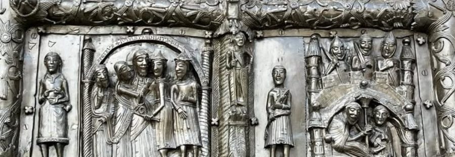Per avvicinare e scoprire la bellissima porta in bronzo romanica di Santa Sofia, a Novgorod, serve innanzitutto l'atlante: la leggenda delle sue origini - non si può certo datare un'opera d'arte se non se ne conosce la storia - è infatti tutto un susseguirsi di nomi di città dell'Europa del Nord, nuclei urbani poco noti …