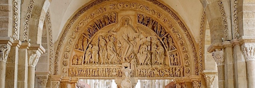 Vézelay, portale del nartece. Avrebbero potuto sfigurarlo a martellate più ancora di quanto non sia già successo, ma nemmeno appiattendone i rilievi fino alla parete avrebbero cancellato uno dei suoi messaggi più forti e nascosti: Vézelay infatti, testimonia e annuncia che il Cristo è il "signore del tempo", e non lo fa attraverso i rilievi, le …